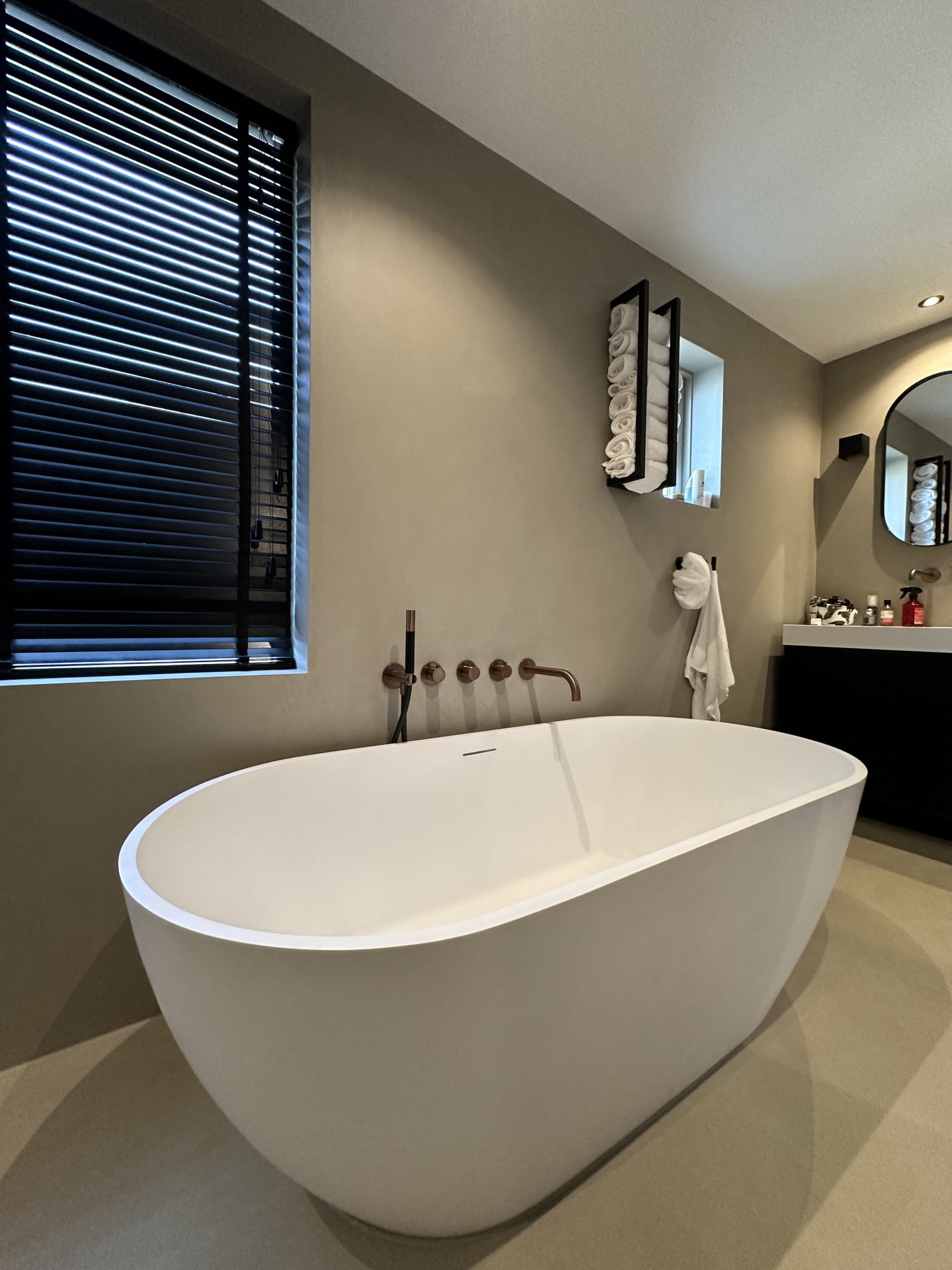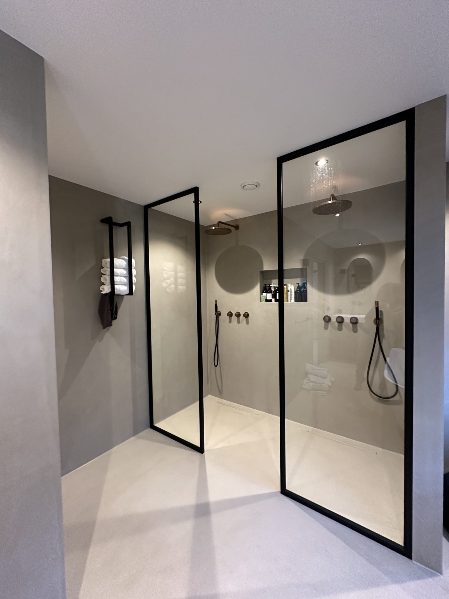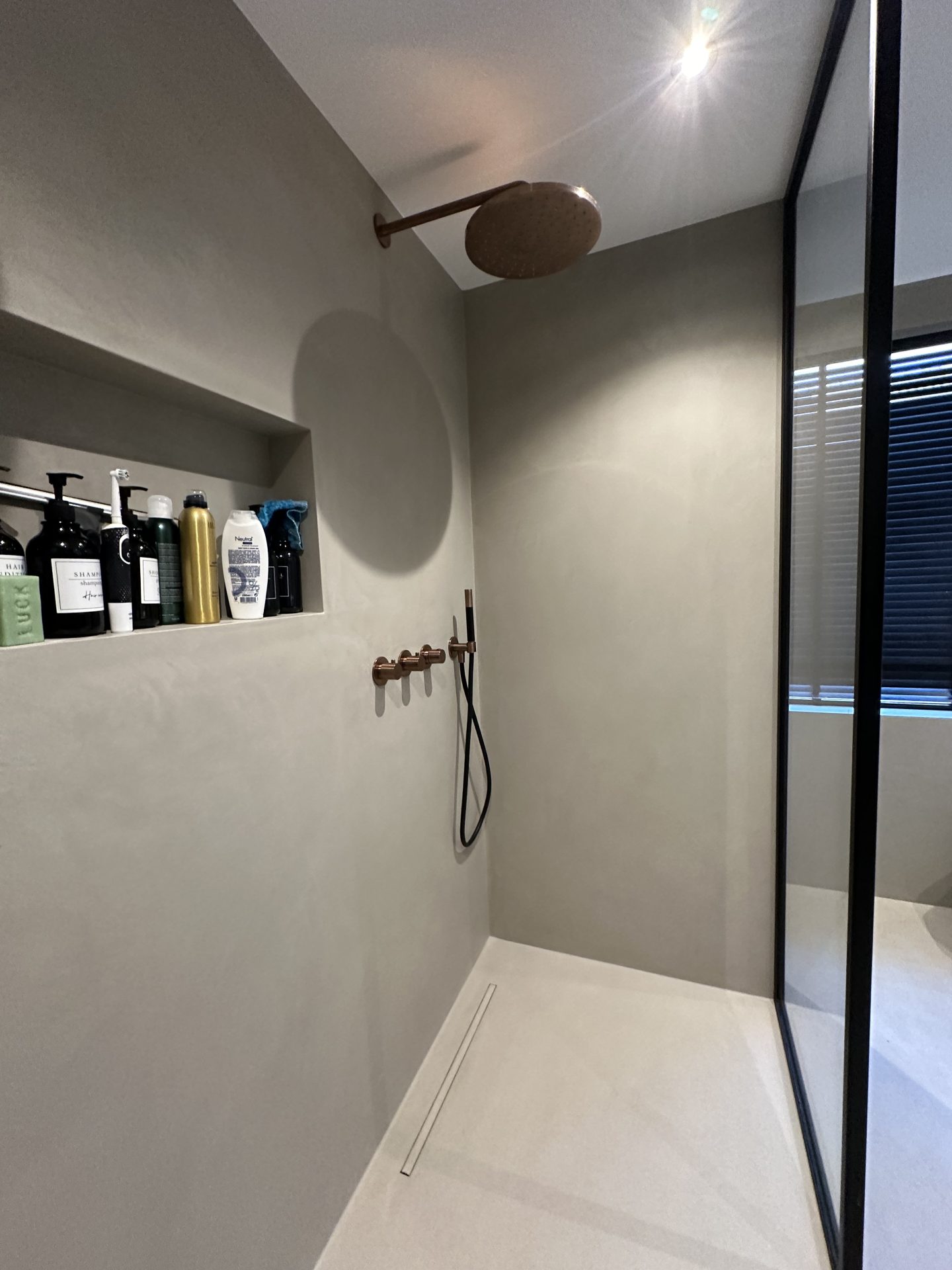 Deze badkamer is een modern en strak project dat gebruik maakt van natuurlijke materialen en een minimalistisch kleurenschema. De betonlook vloeren en strakke lijnen geven de badkamer een luxe uitstraling, met veel aandacht voor detail.