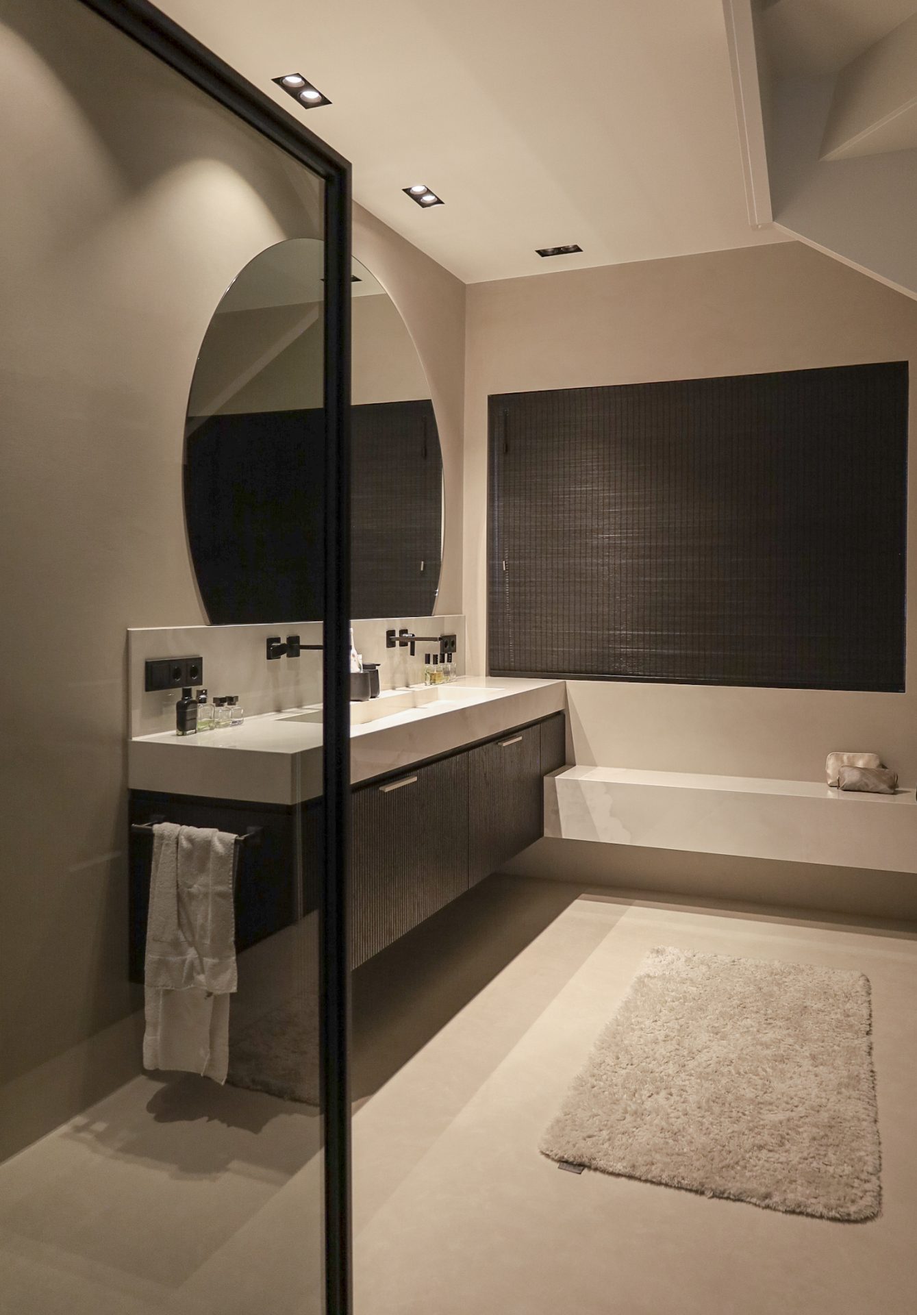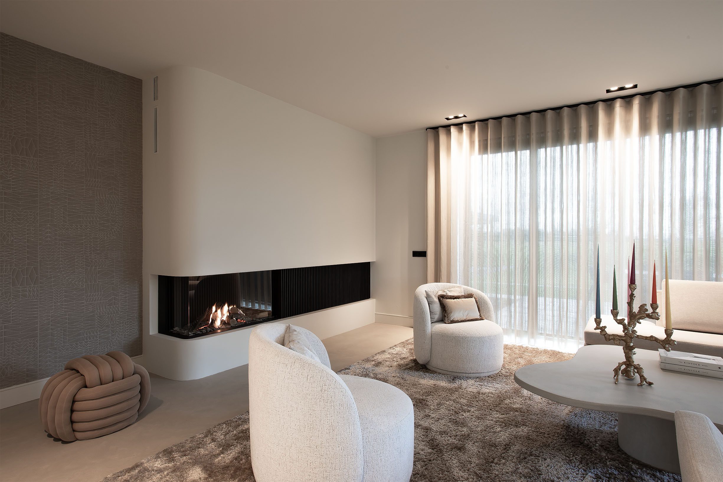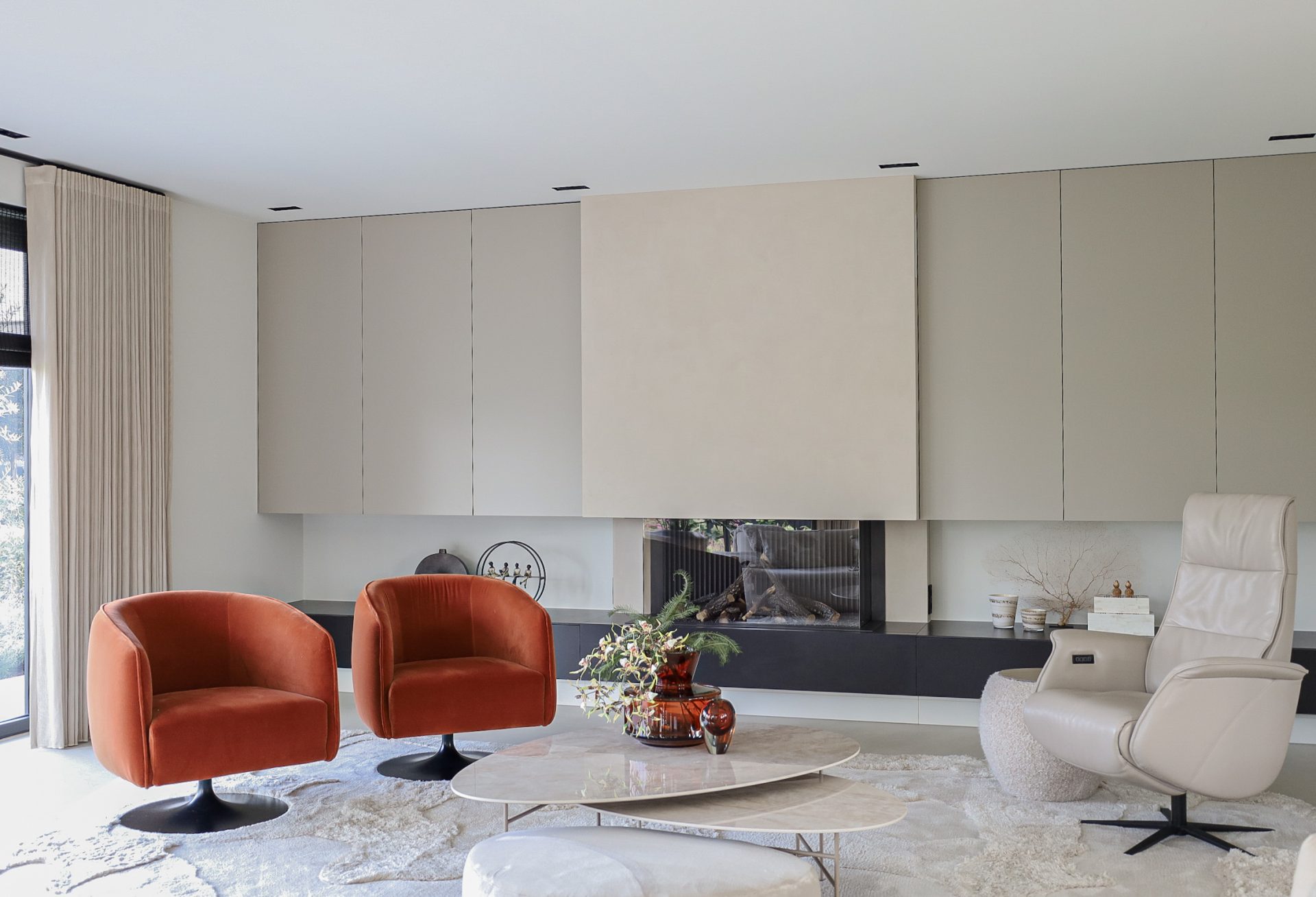 Villa Maartensdijk combineert minimalistisch design met natuurlijke materialen en functionele details. Met een organisch afgewerkte tafel, een trap met microcement en stijlvolle badkamers straalt het interieur luxe en comfort uit in een strak en tijdloos ontwerp.