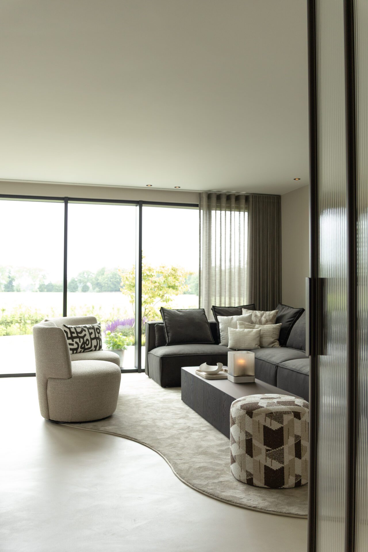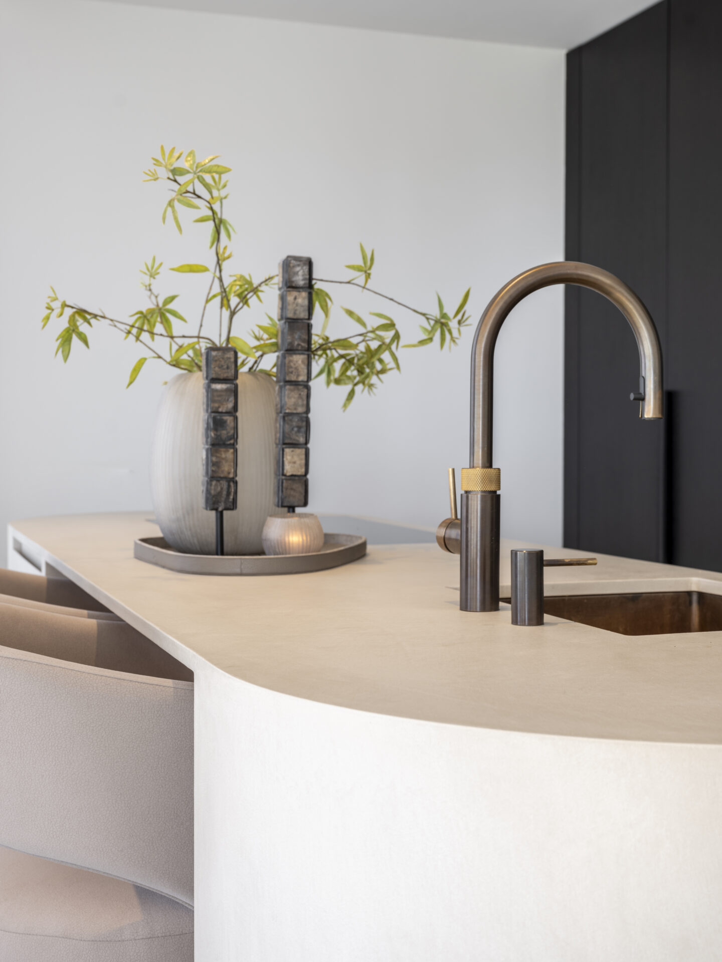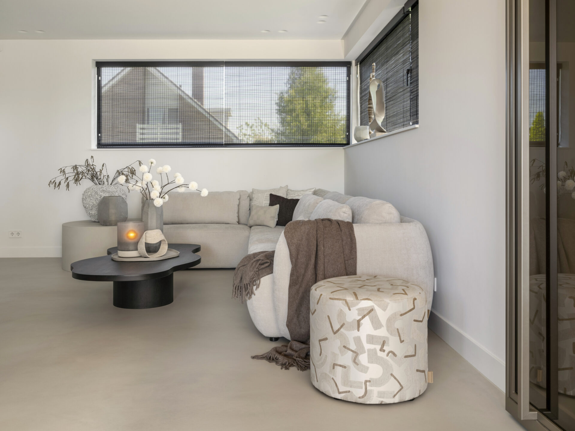 Voor een Woonhuis in Uddel zijn de vloeren op de begane grond afgewerkt met een strakke gietvloer. Het toilet is voorzien van speciaal stucwerk in calco vintage met beton ciré, wat zorgt voor een uniek en karakter vol geheel. Het keukeneiland is volledig afgewerkt in microcement, inclusief de fronten, voor een naadloze en tijdloze uitstraling. Als finishing touch is er een maatwerk eetkamertafel in beton stuc gerealiseerd. Samen creëren deze materialen een warme, minimalistische sfeer die perfect aansluit bij een modern en eigentijds interieur.